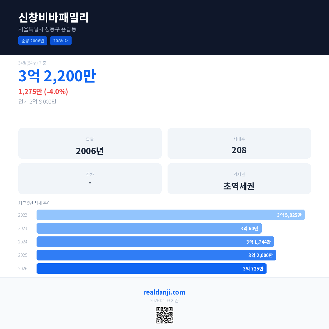 신창비바패밀리은(는) 2006년에 준공되었으며, 현재 20년차입니다. 총 208세대 규모입니다.
