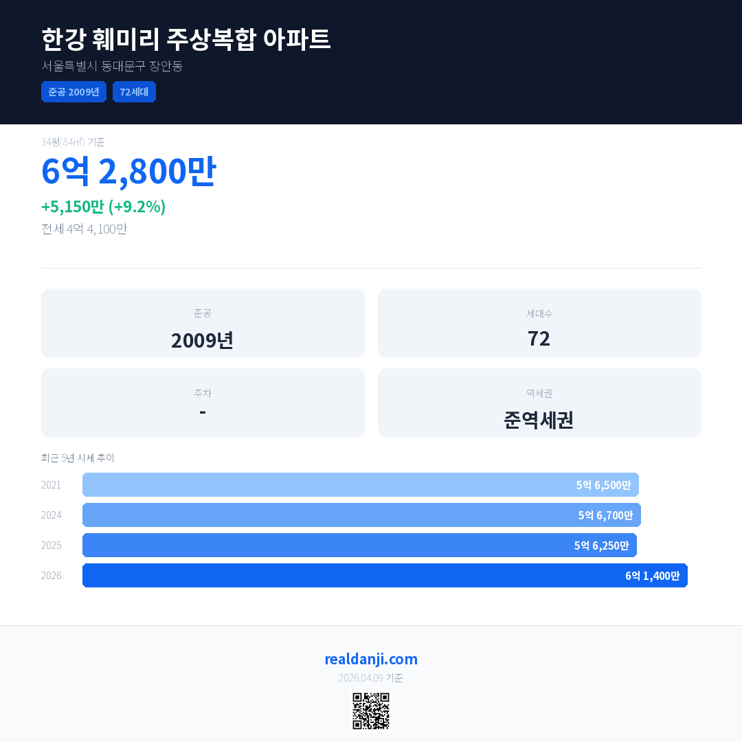 한강 훼미리 주상복합 아파트 국민평형 기준 2026년 평균 거래가는 6억 1,400만으로, 전년 대비 9.2% 상승 했습니다.