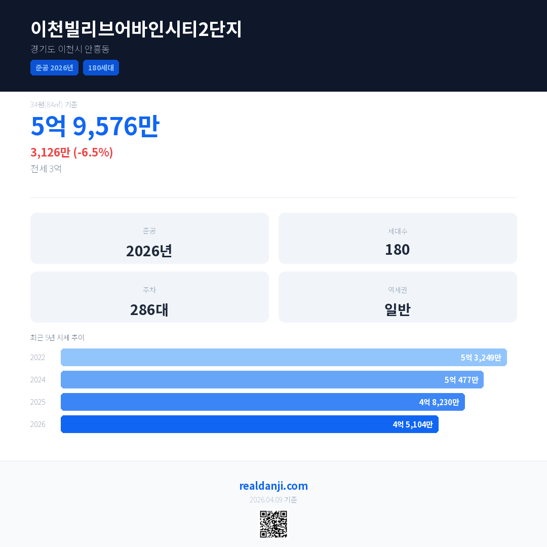 이천빌리브어바인시티2단지 최근 거래가는 5억 9,576만입니다. (2026-03)