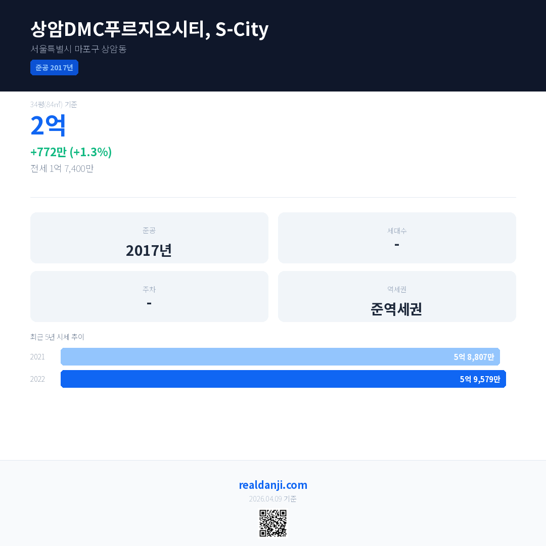 상암DMC푸르지오시티, S-City은(는) 2017년에 준공되었으며, 현재 9년차입니다.