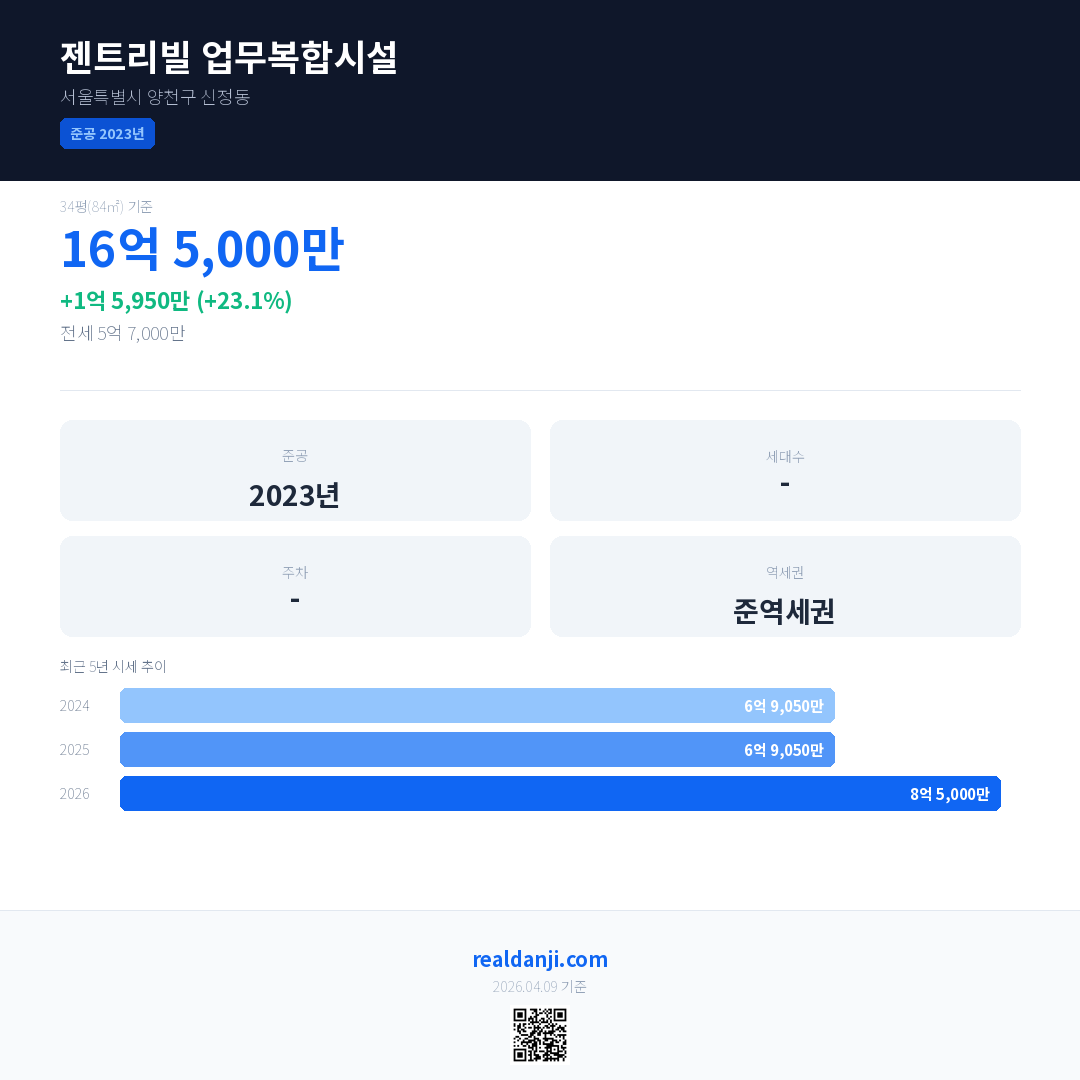 젠트리빌 업무복합시설 국민평형 기준 2026년 평균 거래가는 8억 5,000만으로, 전년 대비 23.1% 상승 했습니다.