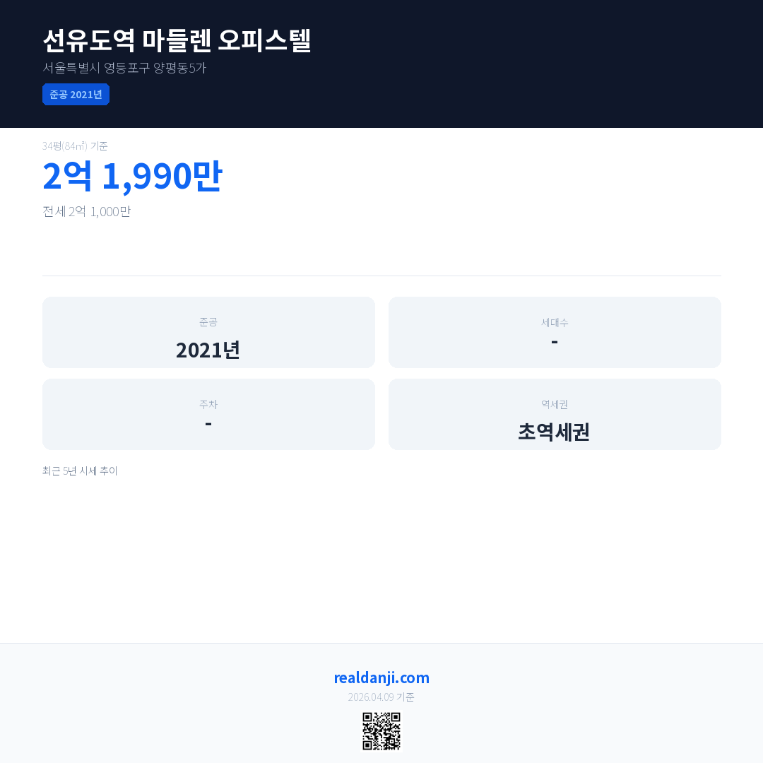 선유도역 마들렌 오피스텔 최근 거래가는 2억 1,990만입니다. (2023-10)