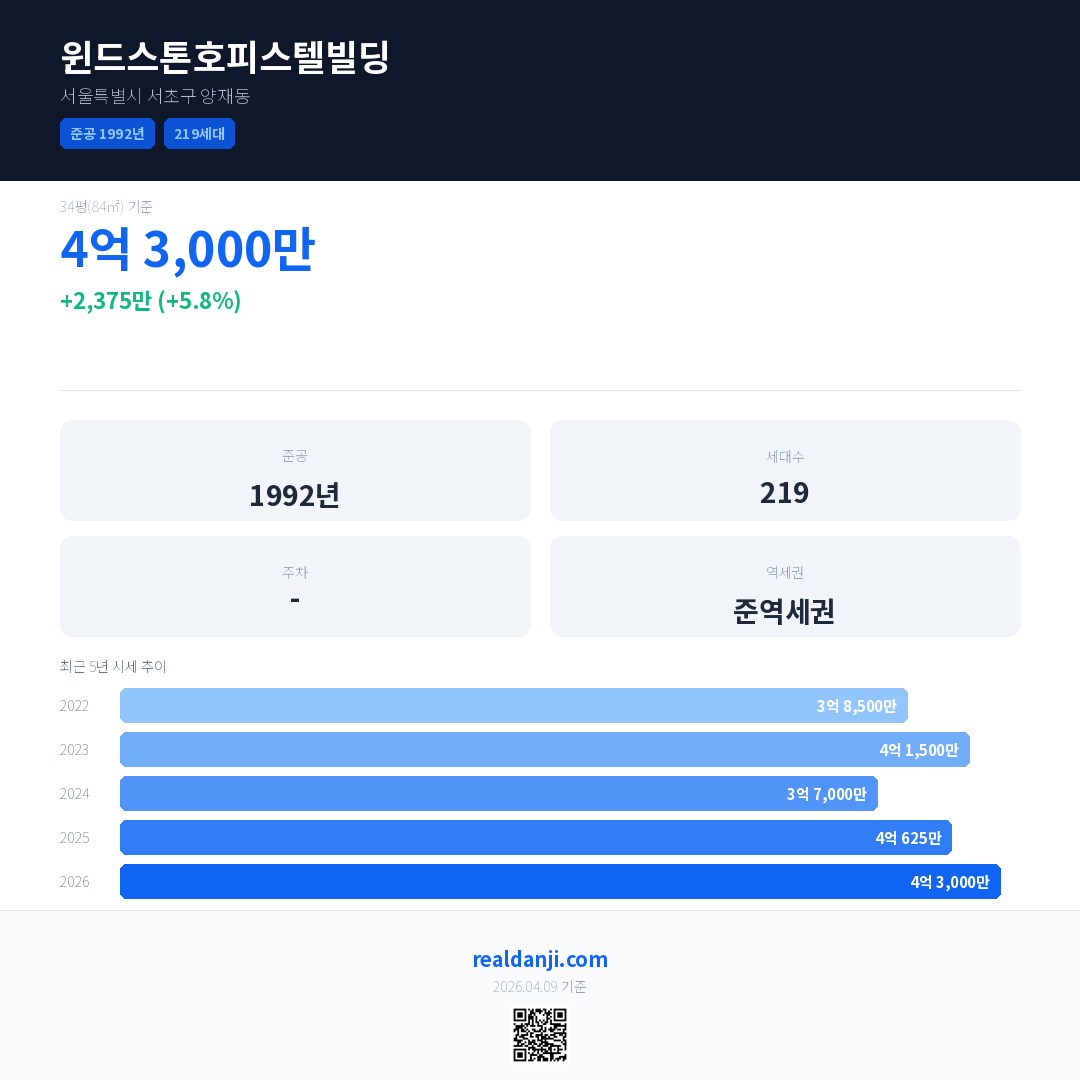 윈드스톤호피스텔빌딩 국민평형 기준 2026년 평균 거래가는 4억 3,000만으로, 전년 대비 5.8% 상승 했습니다.