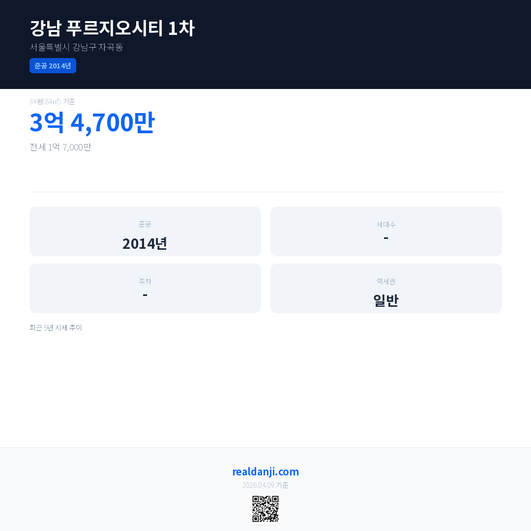 강남 푸르지오시티 1차 최근 거래가는 3억 4,700만입니다. (2025-12)
