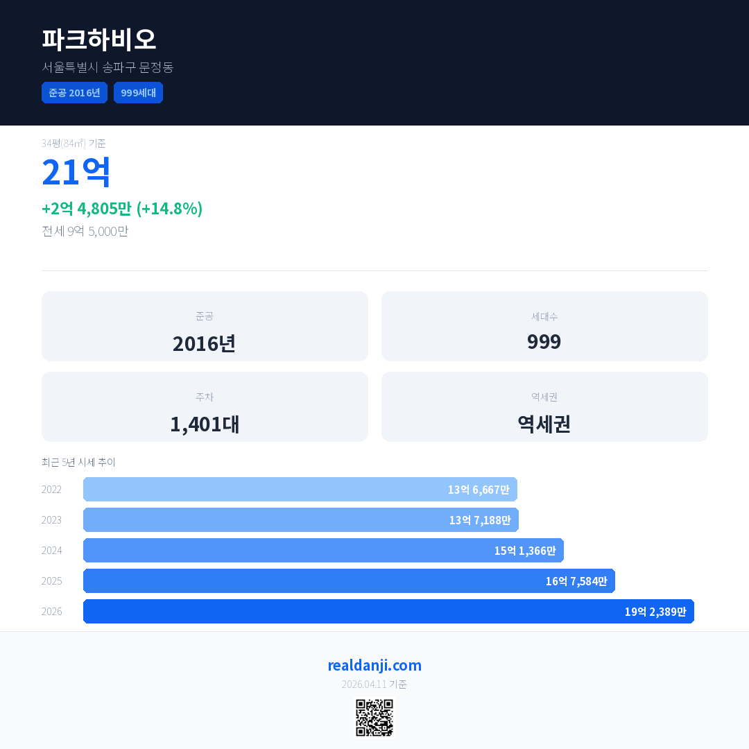 파크하비오 국민평형 기준 2026년 평균 거래가는 19억 2,389만으로, 전년 대비 14.8% 상승 했습니다.