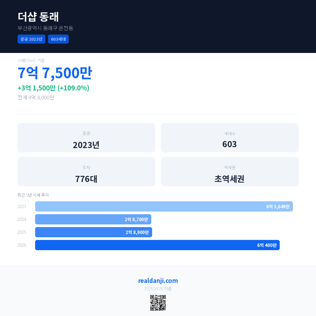 더샵 동래 최근 거래가는 7억 7,500만입니다. (2026-03)