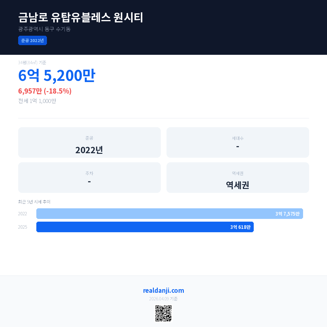 금남로 유탑유블레스 원시티 최근 거래가는 6억 5,200만입니다. (2026-02)
