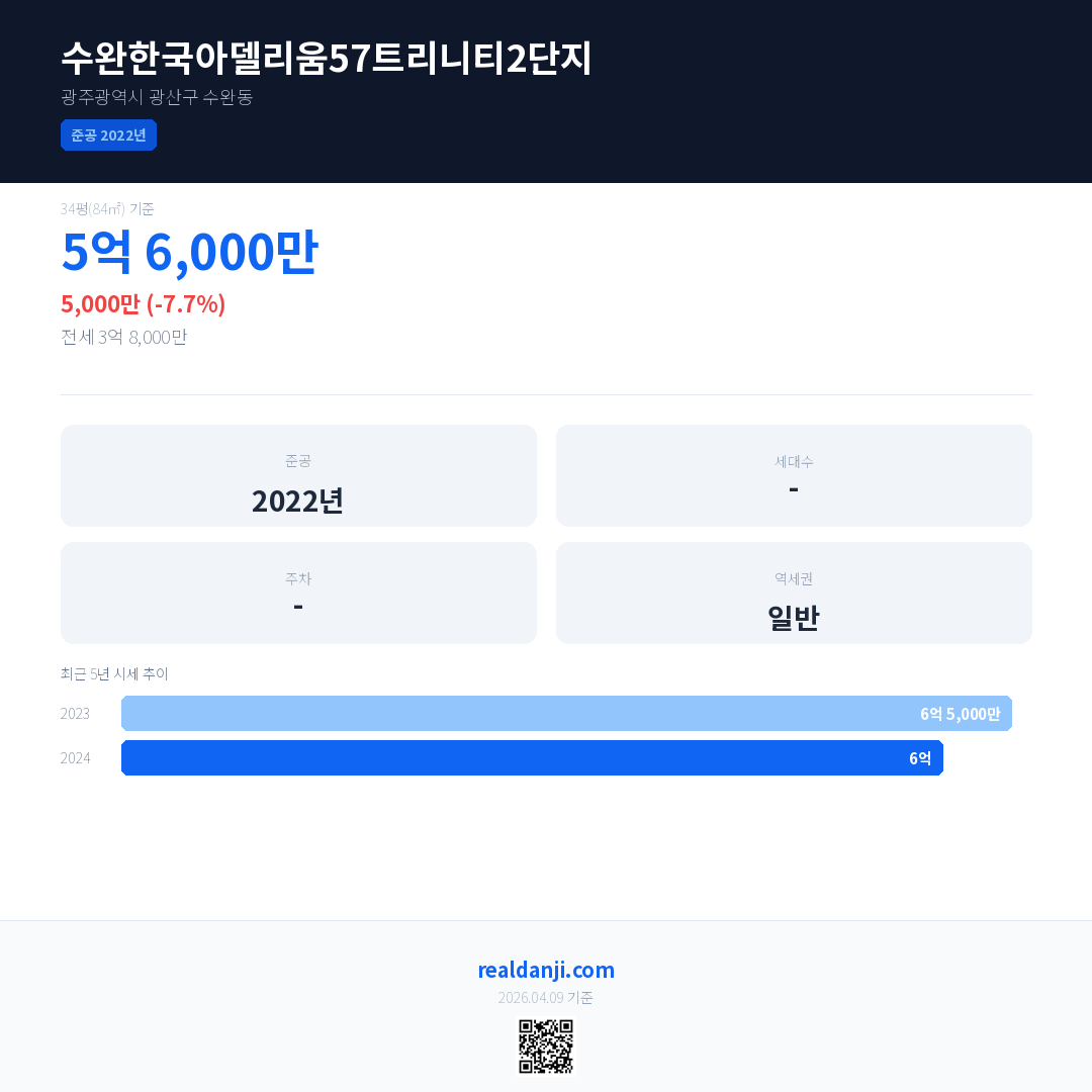 수완한국아델리움57트리니티2단지은(는) 2022년에 준공되었으며, 현재 4년차입니다.