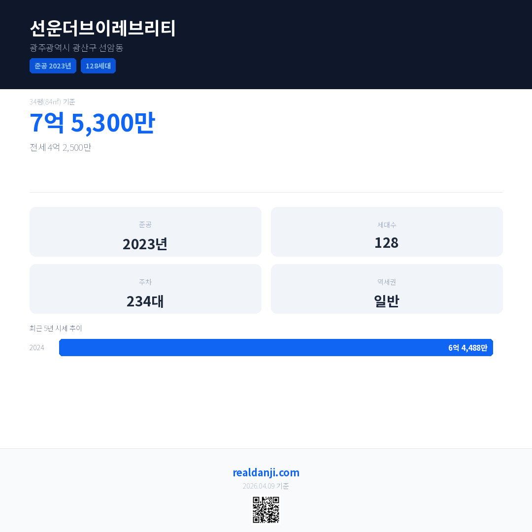 선운더브이레브리티은(는) 2023년에 준공되었으며, 현재 3년차입니다. 총 128세대 규모입니다.