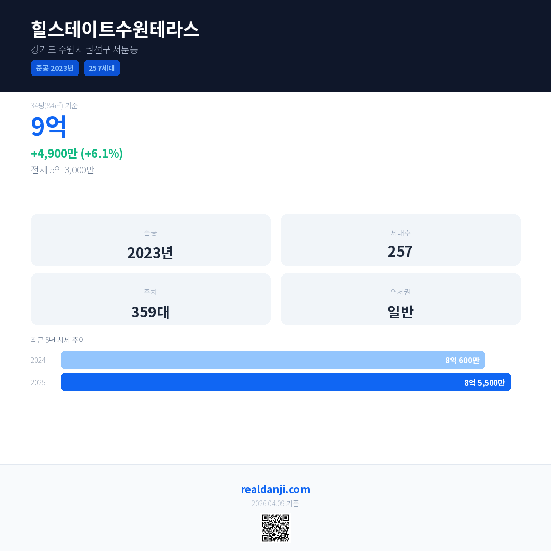 힐스테이트수원테라스 국민평형 기준 2025년 평균 거래가는 8억 5,500만으로, 전년 대비 6.1% 상승 했습니다.