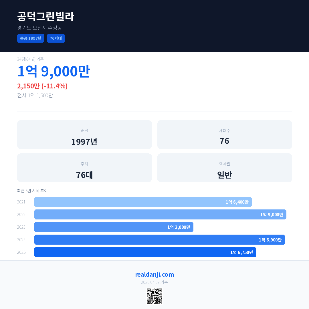 공덕그린빌라 국민평형 기준 2025년 평균 거래가는 1억 6,750만으로, 전년 대비 11.4% 하락 했습니다.