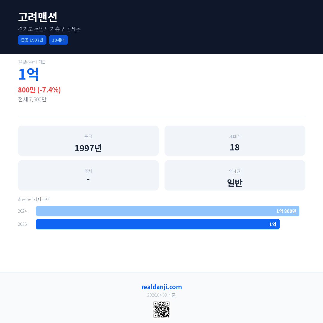 고려맨션 국민평형 기준 2026년 평균 거래가는 1억으로, 전년 대비 7.4% 하락 했습니다.