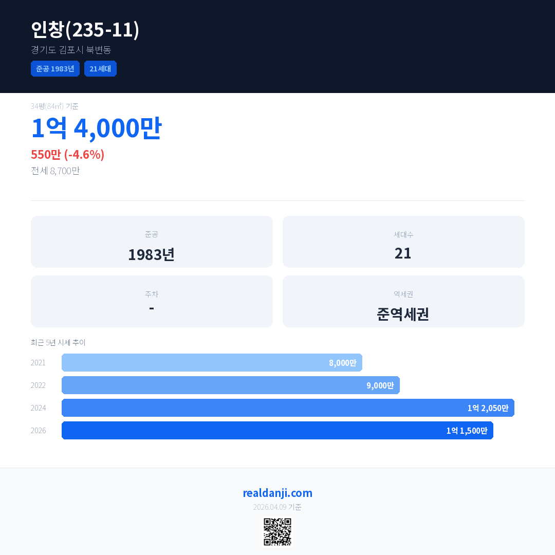 인창(235-11) 국민평형 기준 2026년 평균 거래가는 1억 1,500만으로, 전년 대비 4.6% 하락 했습니다.