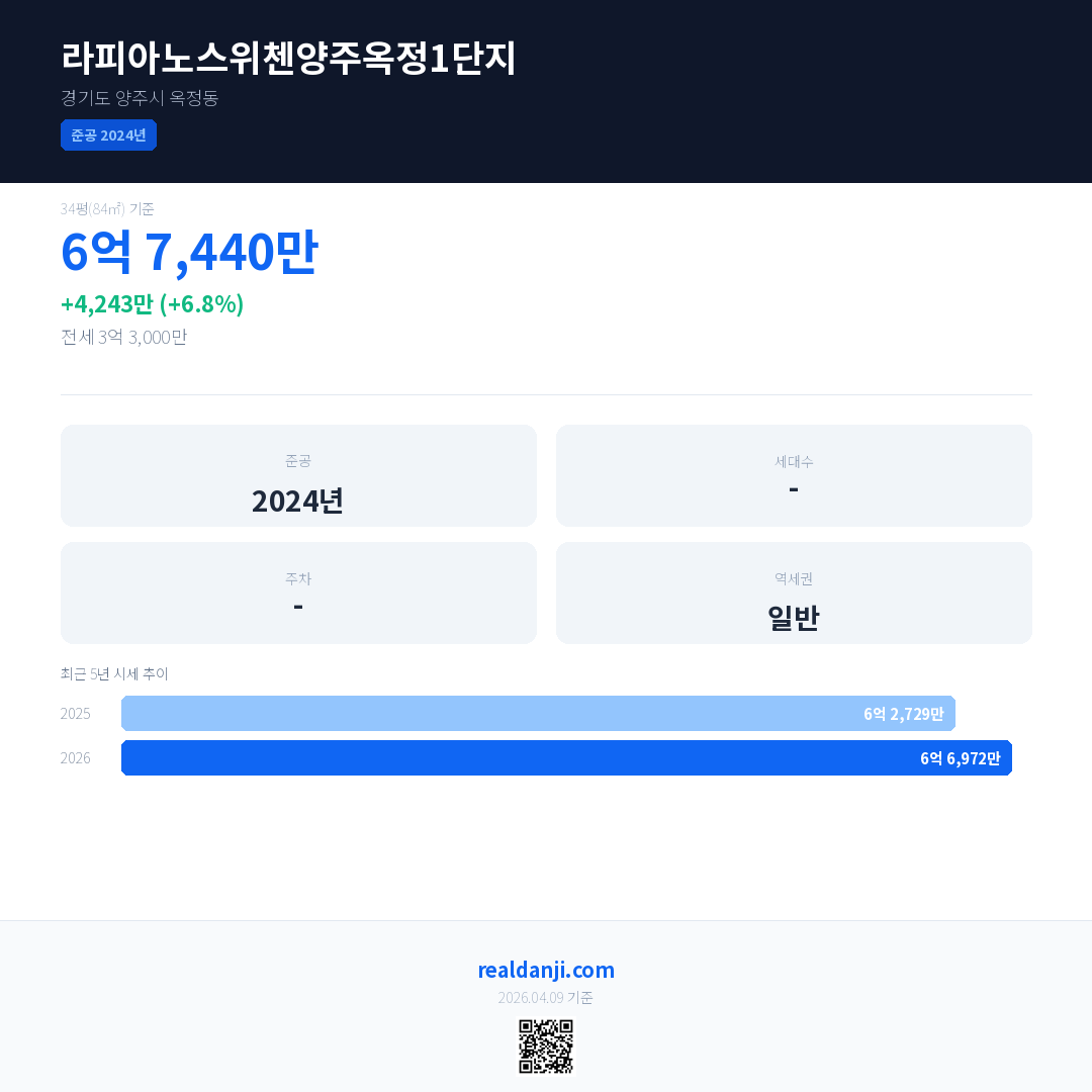 라피아노스위첸양주옥정1단지 국민평형 기준 2026년 평균 거래가는 6억 6,972만으로, 전년 대비 6.8% 상승 했습니다.