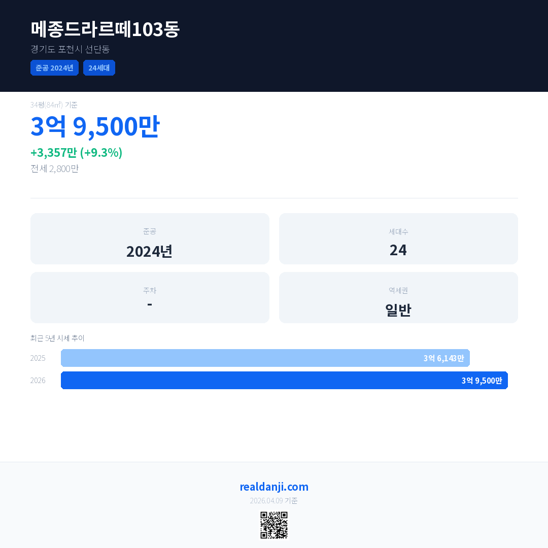메종드라르떼103동은(는) 2024년에 준공되었으며, 현재 2년차입니다. 총 24세대 규모입니다.