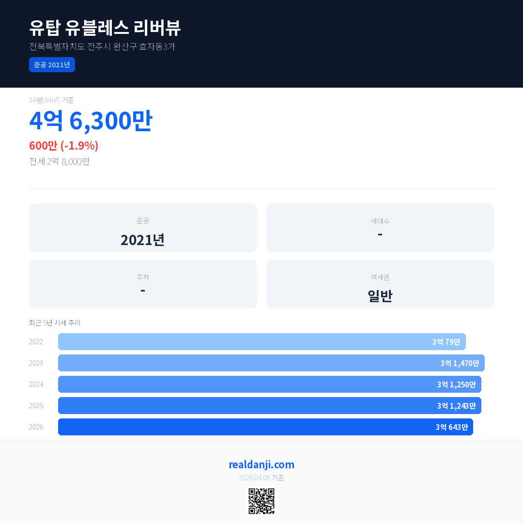 유탑 유블레스 리버뷰 국민평형 기준 2026년 평균 거래가는 3억 643만으로, 전년 대비 1.9% 하락 했습니다.