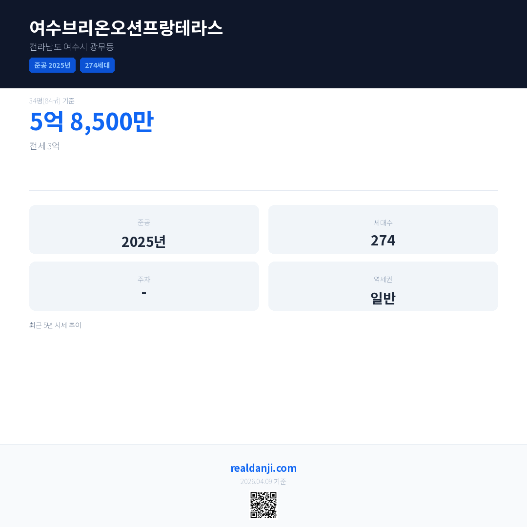 여수브리온오션프랑테라스 최근 거래가는 5억 8,500만입니다. (2025-09)