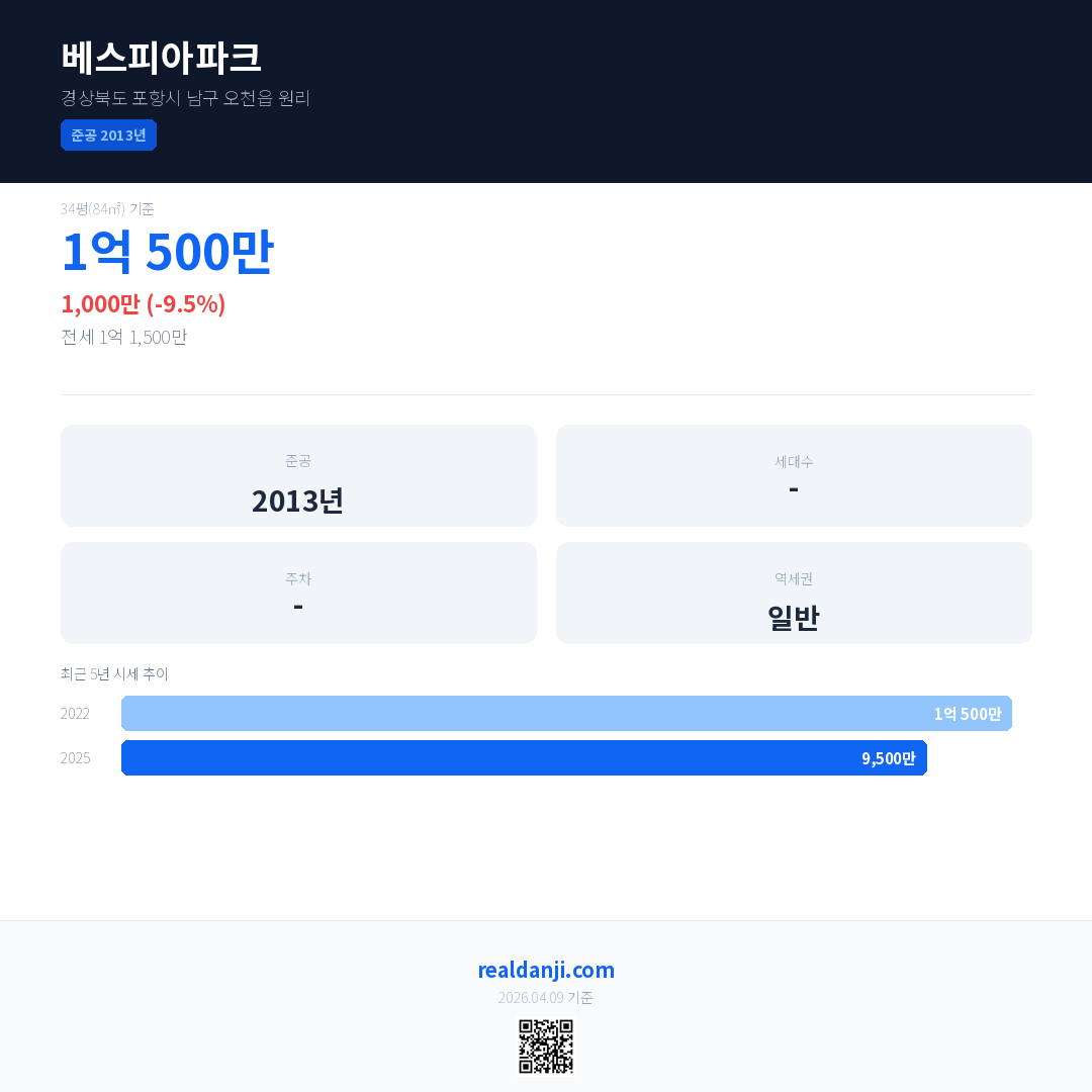 베스피아파크 국민평형 기준 2025년 평균 거래가는 9,500만으로, 전년 대비 9.5% 하락 했습니다.