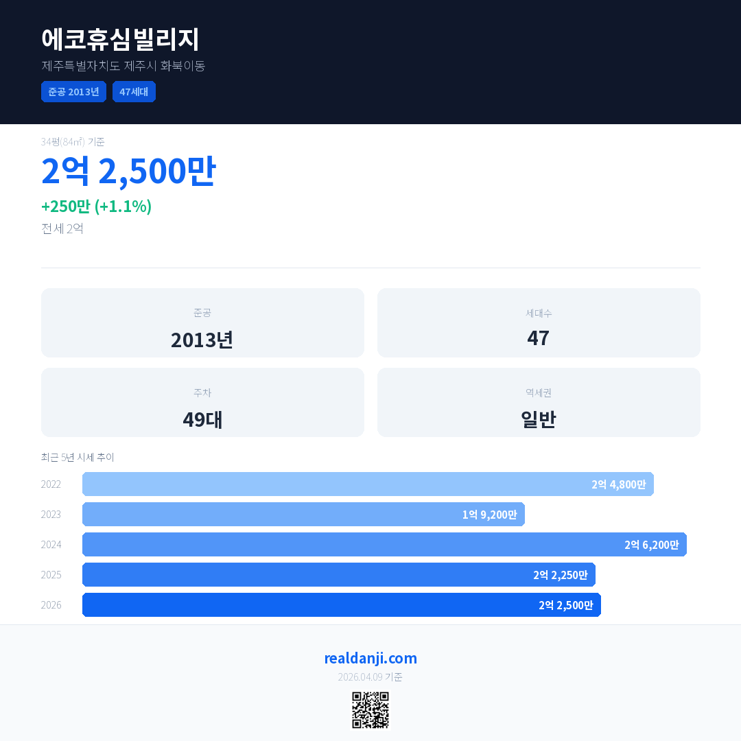 에코휴심빌리지 국민평형 기준 2026년 평균 거래가는 2억 2,500만으로, 전년 대비 1.1% 상승 했습니다.