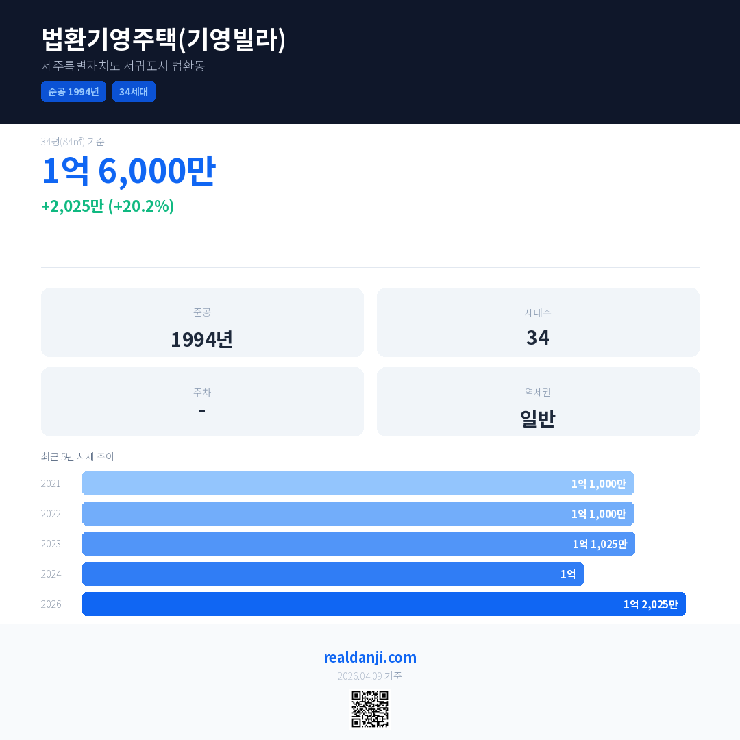 법환기영주택(기영빌라) 국민평형 기준 2026년 평균 거래가는 1억 2,025만으로, 전년 대비 20.2% 상승 했습니다.