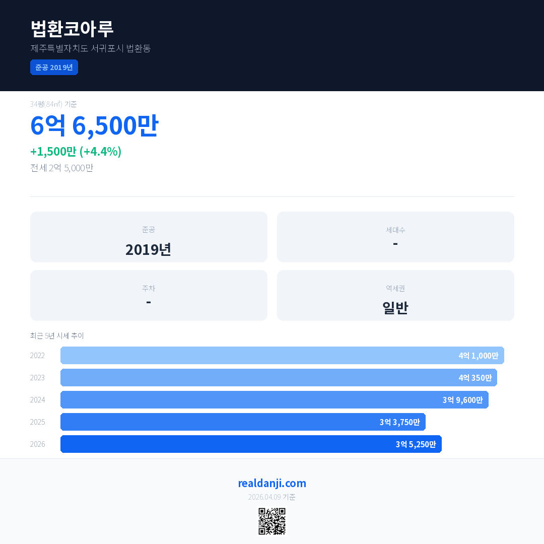 법환코아루 국민평형 기준 2026년 평균 거래가는 3억 5,250만으로, 전년 대비 4.4% 상승 했습니다.