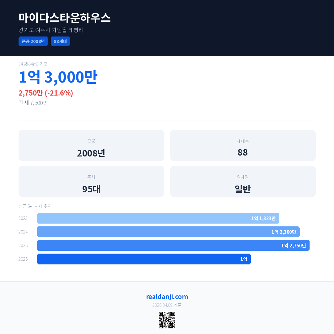 마이다스타운하우스 최근 거래가는 1억 3,000만입니다. (2026-03)