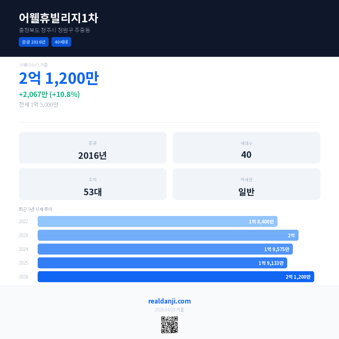 어웰휴빌리지1차 국민평형 기준 2026년 평균 거래가는 2억 1,200만으로, 전년 대비 10.8% 상승 했습니다.