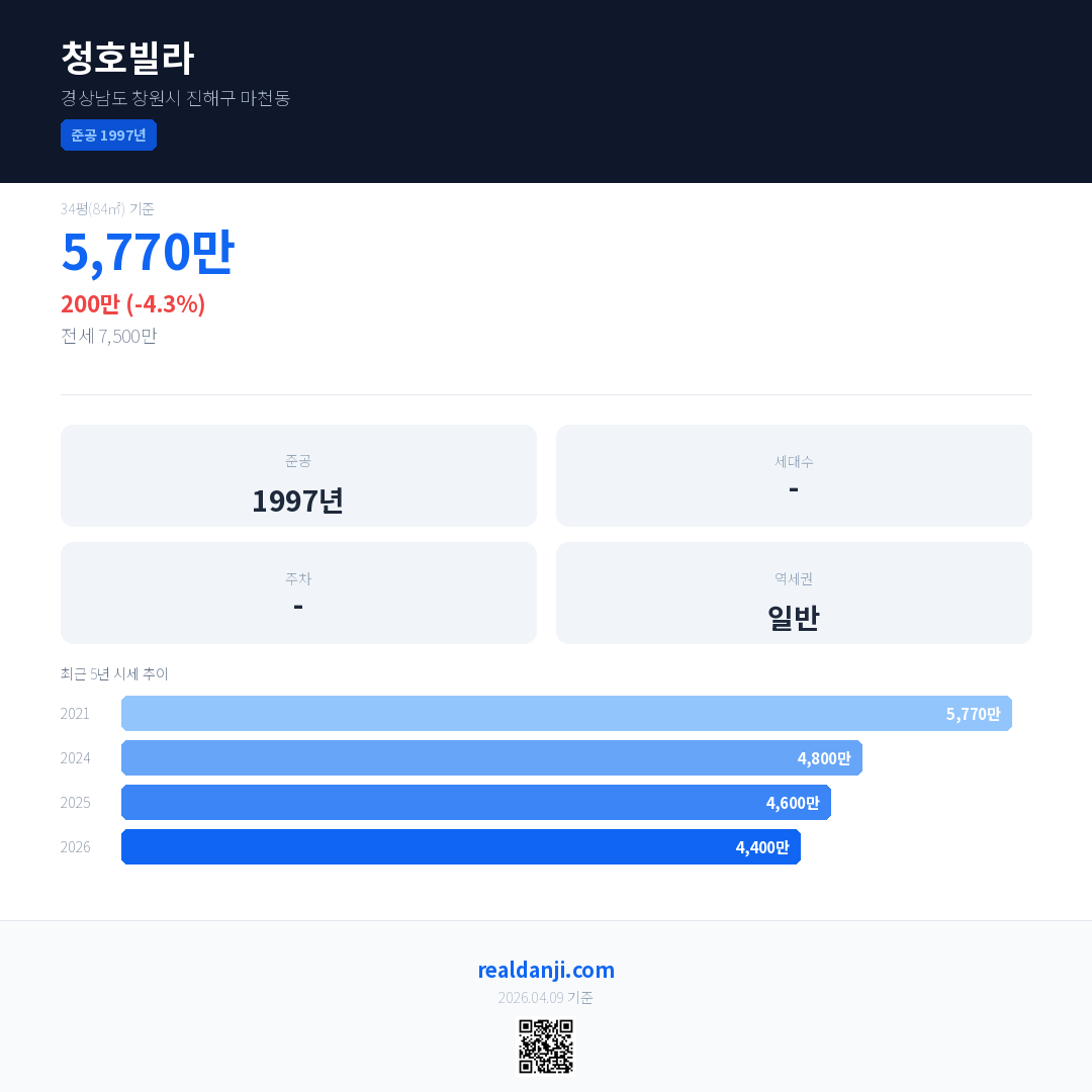 청호빌라 최근 거래가는 5,770만입니다. (2026-03)