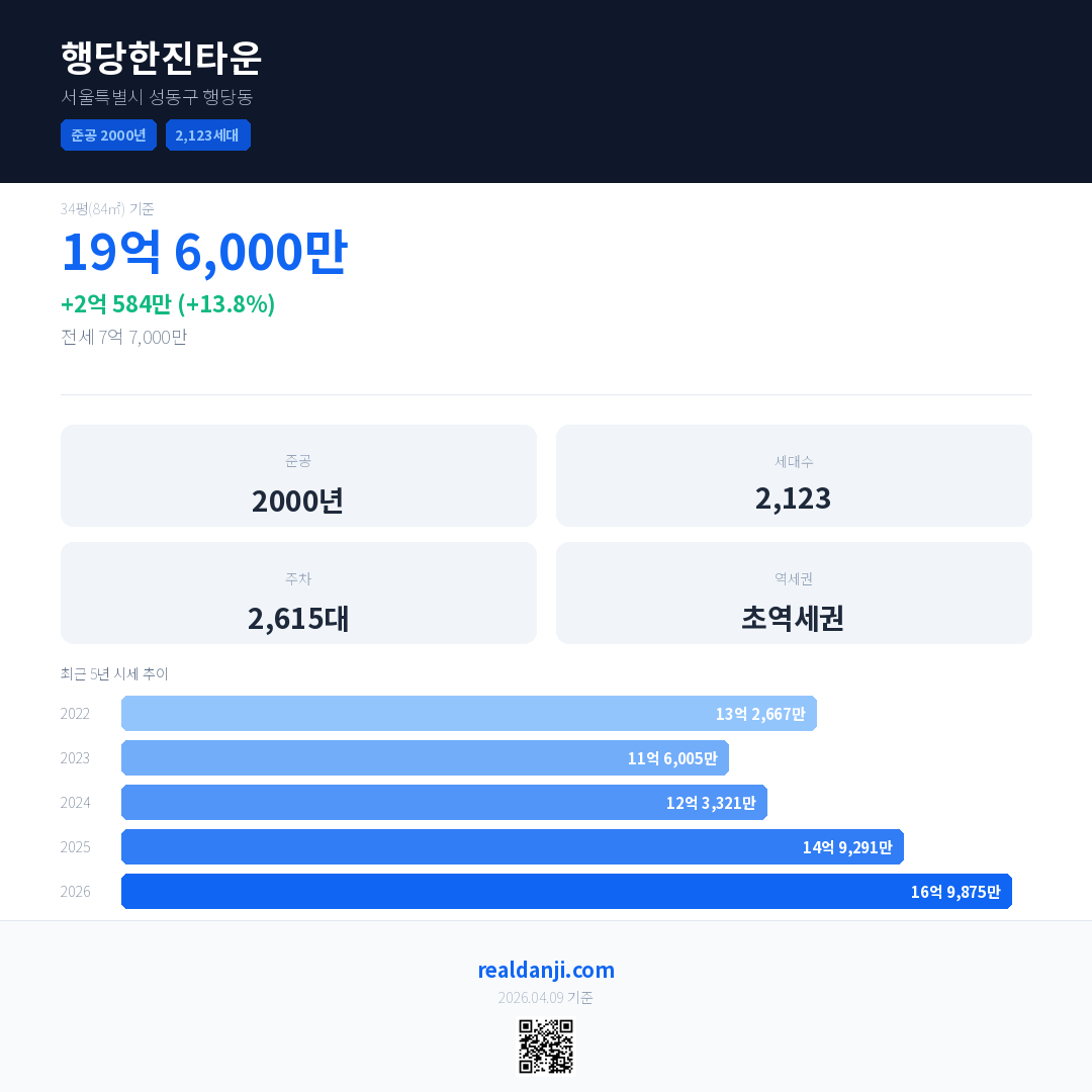 행당한진타운 국민평형 기준 2026년 평균 거래가는 16억 9,875만으로, 전년 대비 13.8% 상승 했습니다.