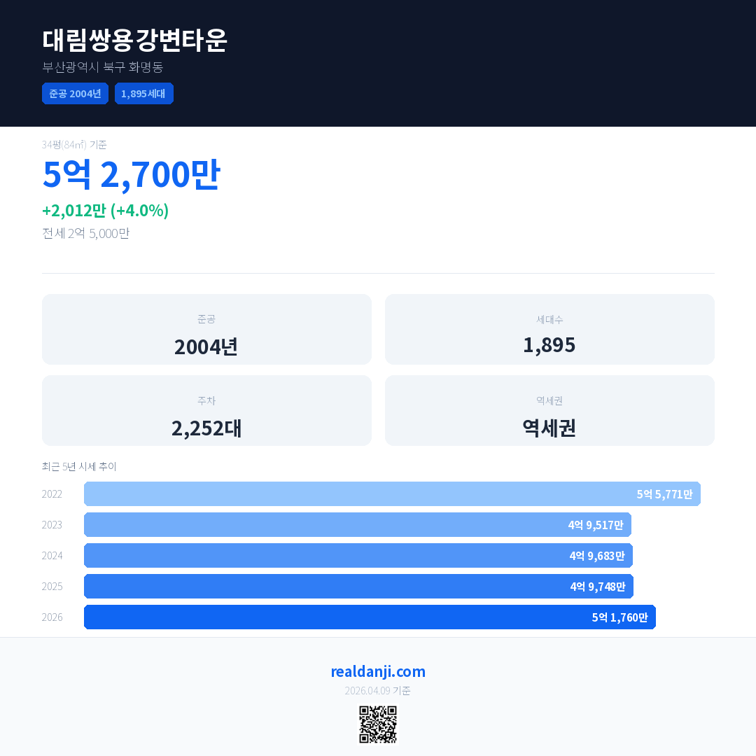 대림쌍용강변타운 국민평형 기준 2026년 평균 거래가는 5억 1,760만으로, 전년 대비 4.0% 상승 했습니다.
