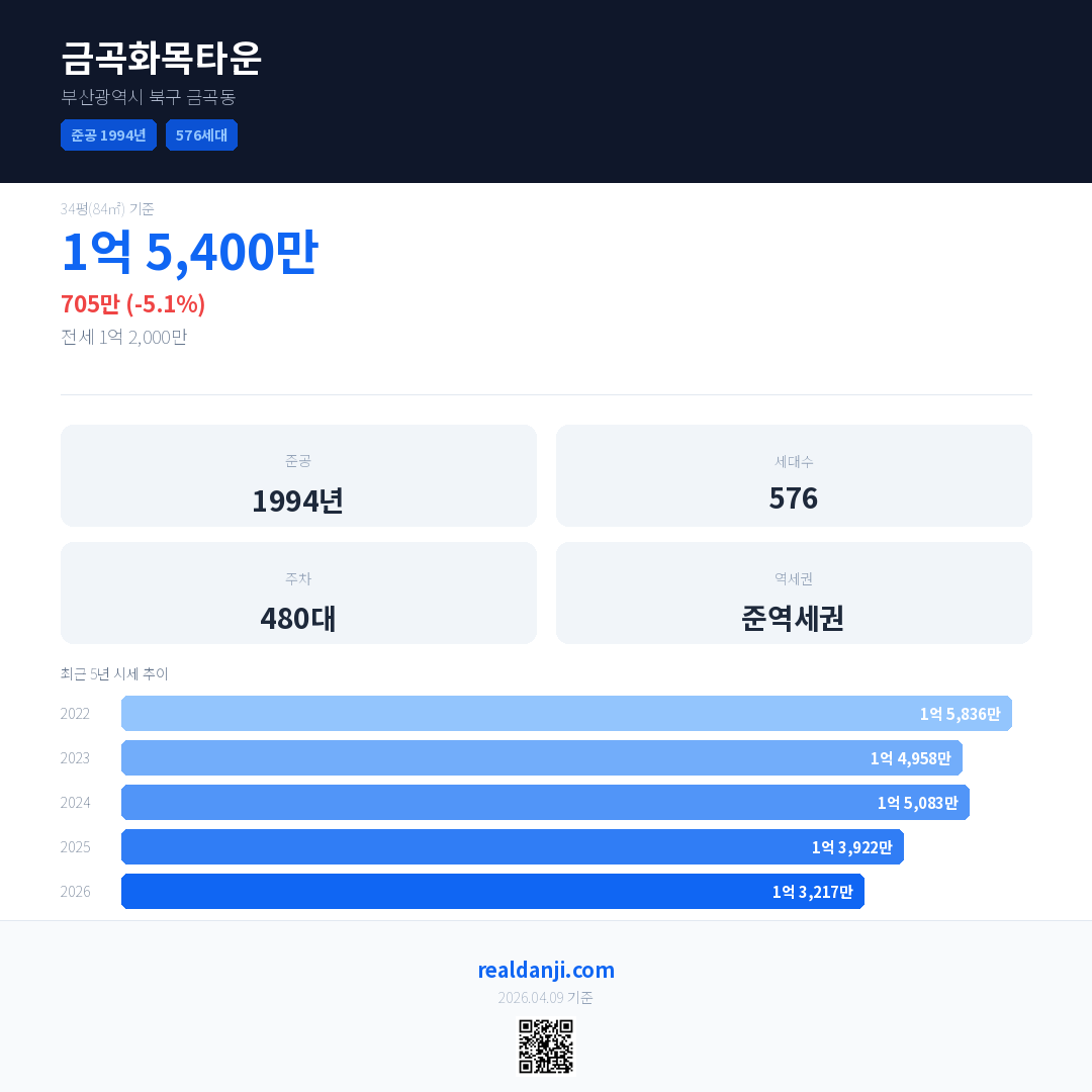 금곡화목타운 국민평형 기준 2026년 평균 거래가는 1억 3,217만으로, 전년 대비 5.1% 하락 했습니다.