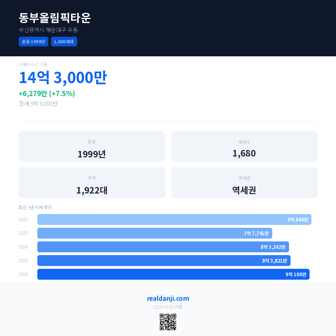 동부올림픽타운 최근 거래가는 14억 3,000만입니다. (2026-03)
