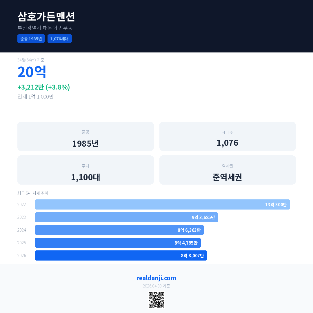 삼호가든맨션 국민평형 기준 2026년 평균 거래가는 8억 8,007만으로, 전년 대비 3.8% 상승 했습니다.