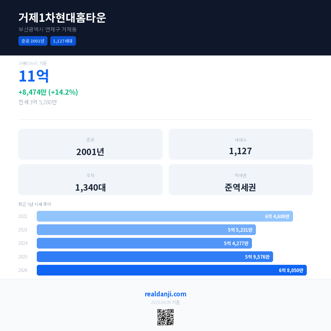 거제1차현대홈타운은(는) 2001년에 준공되었으며, 현재 25년차입니다. 총 1,127세대 규모입니다.