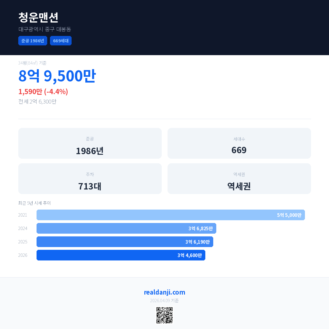 청운맨션 국민평형 기준 2026년 평균 거래가는 3억 4,600만으로, 전년 대비 4.4% 하락 했습니다.