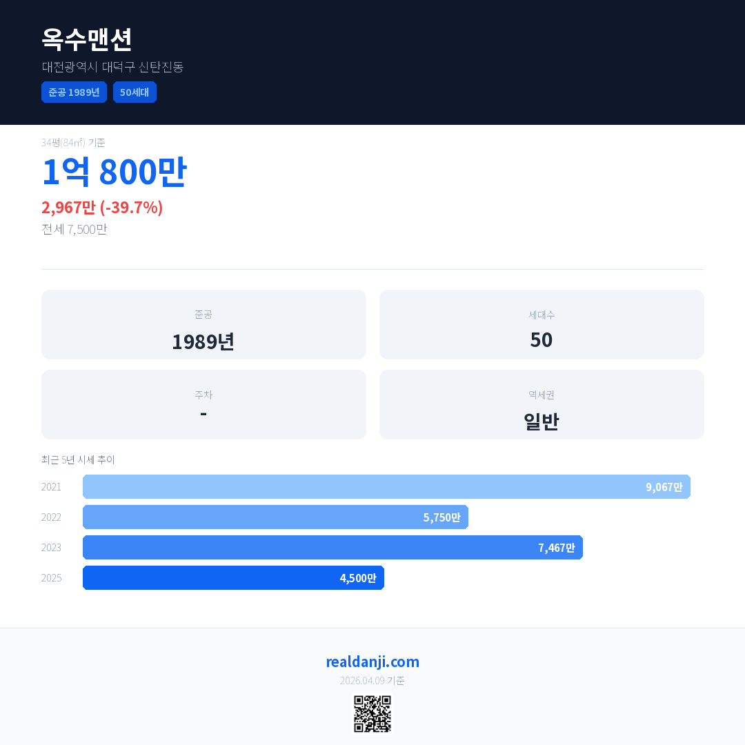 옥수맨션 국민평형 기준 2025년 평균 거래가는 4,500만으로, 전년 대비 39.7% 하락 했습니다.
