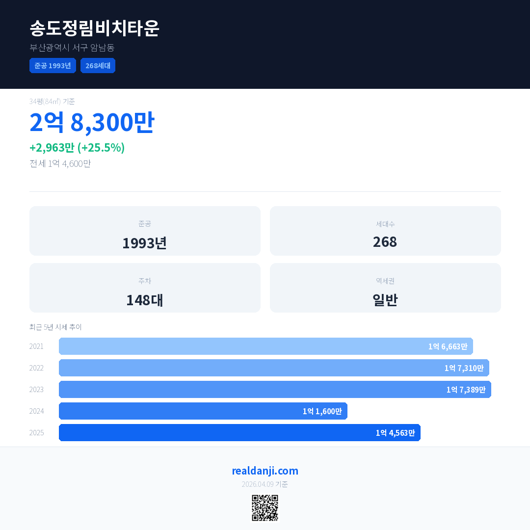 송도정림비치타운은(는) 1993년에 준공되었으며, 현재 33년차입니다. 총 268세대 규모입니다.
