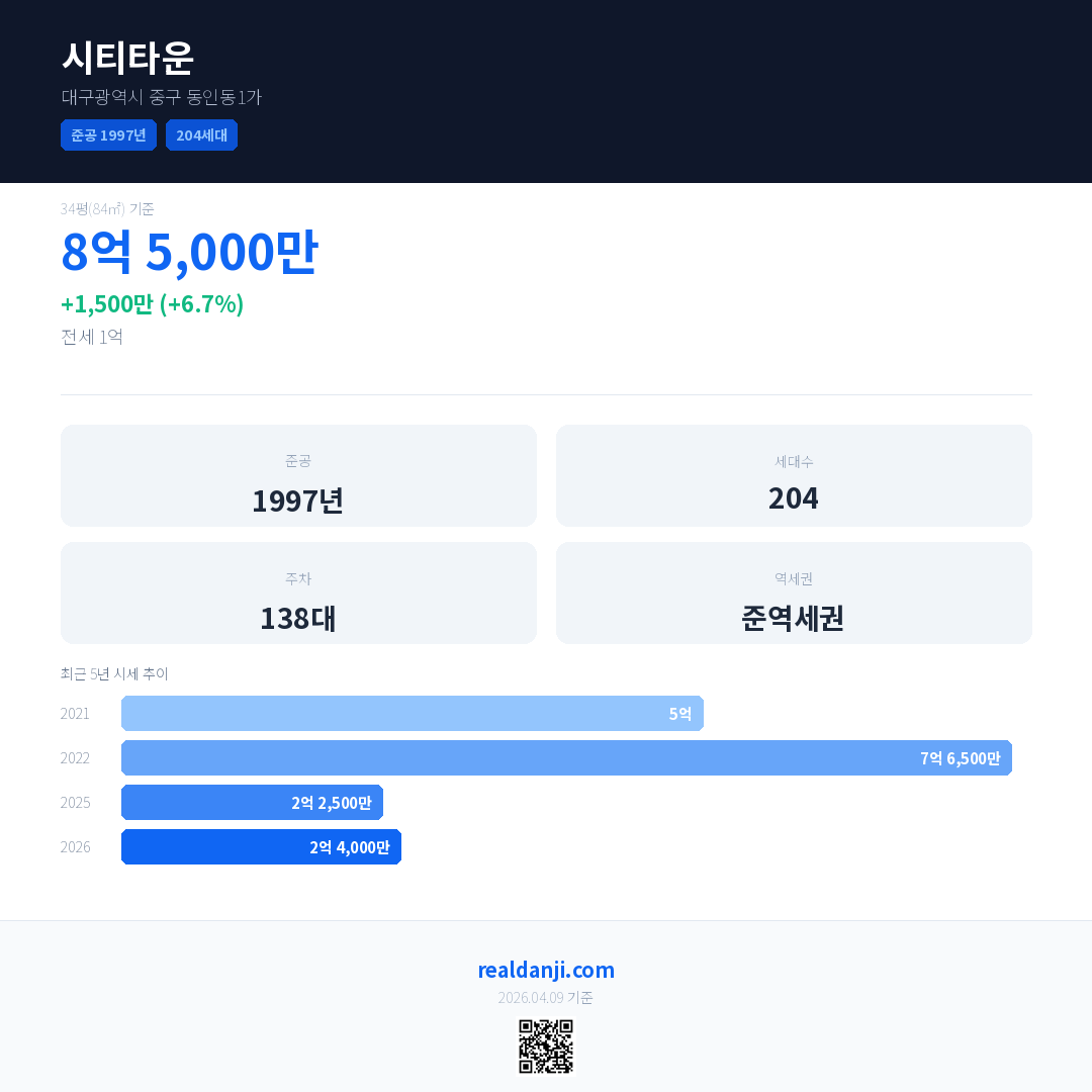 시티타운 국민평형 기준 2026년 평균 거래가는 2억 4,000만으로, 전년 대비 6.7% 상승 했습니다.