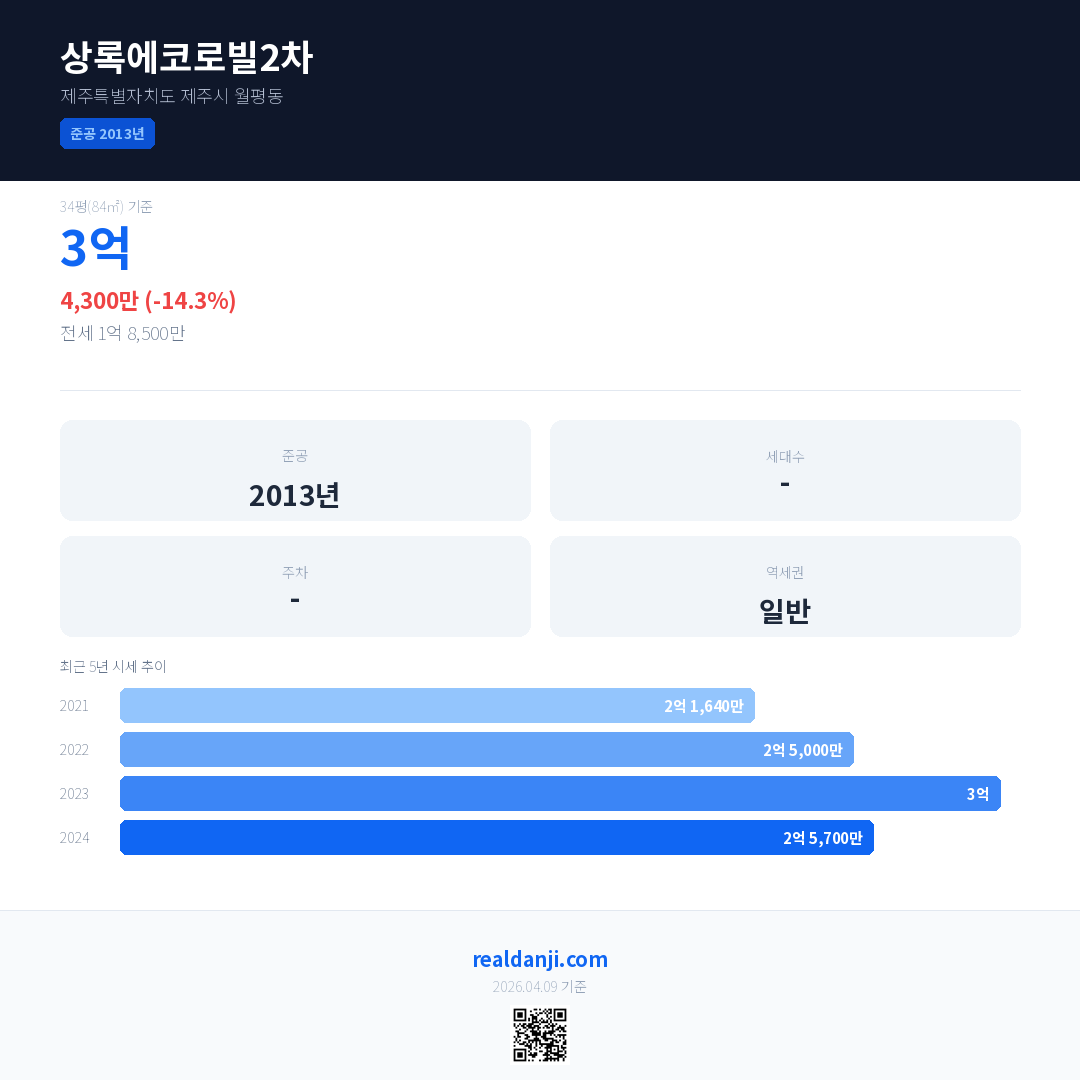 상록에코로빌2차 국민평형 기준 2024년 평균 거래가는 2억 5,700만으로, 전년 대비 14.3% 하락 했습니다.