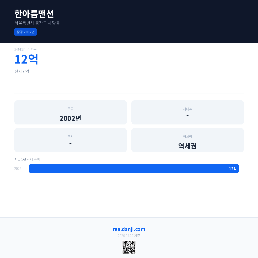한아름맨션 최근 거래가는 12억입니다. (2025-10)