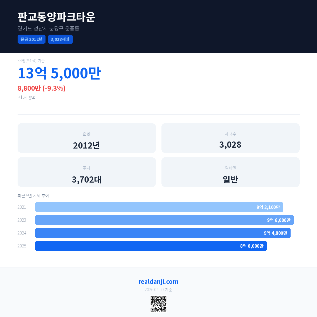 판교동양파크타운 최근 거래가는 13억 5,000만입니다. (2025-12)
