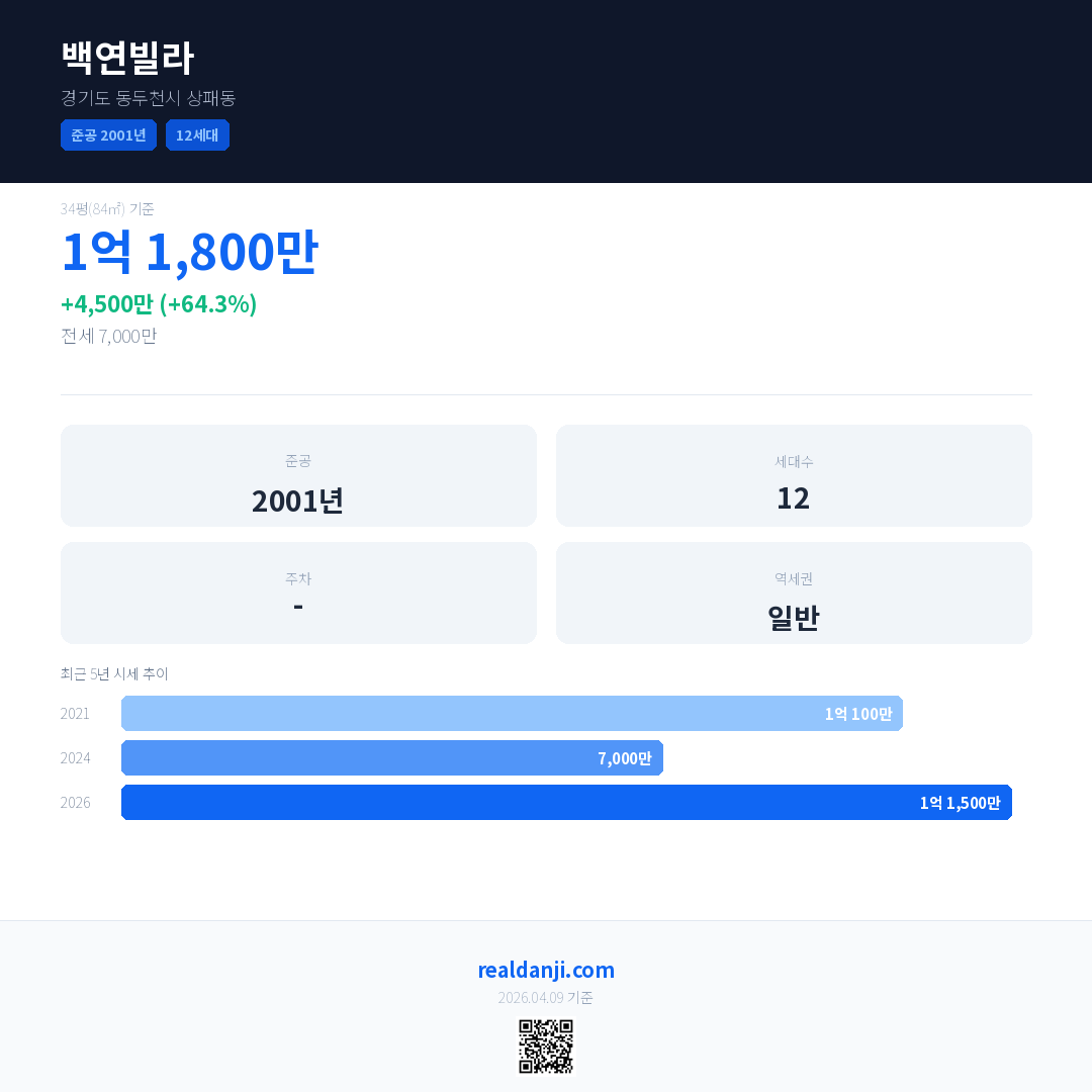 백연빌라 국민평형 기준 2026년 평균 거래가는 1억 1,500만으로, 전년 대비 64.3% 상승 했습니다.