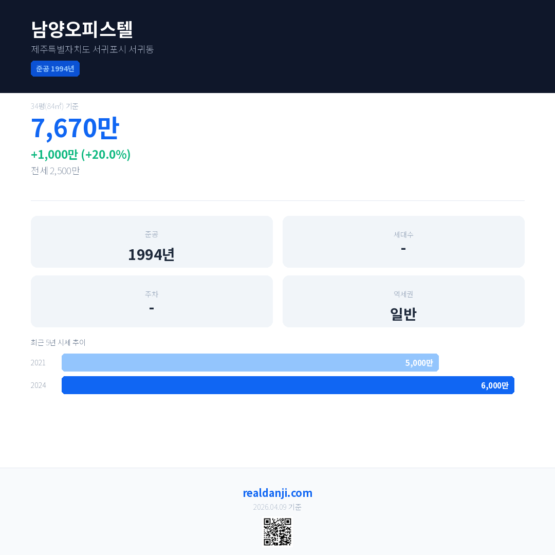 남양오피스텔 국민평형 기준 2024년 평균 거래가는 6,000만으로, 전년 대비 20.0% 상승 했습니다.