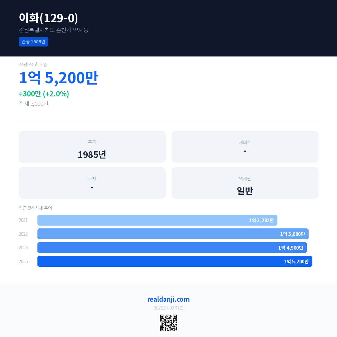 이화(129-0) 국민평형 기준 2025년 평균 거래가는 1억 5,200만으로, 전년 대비 2.0% 상승 했습니다.