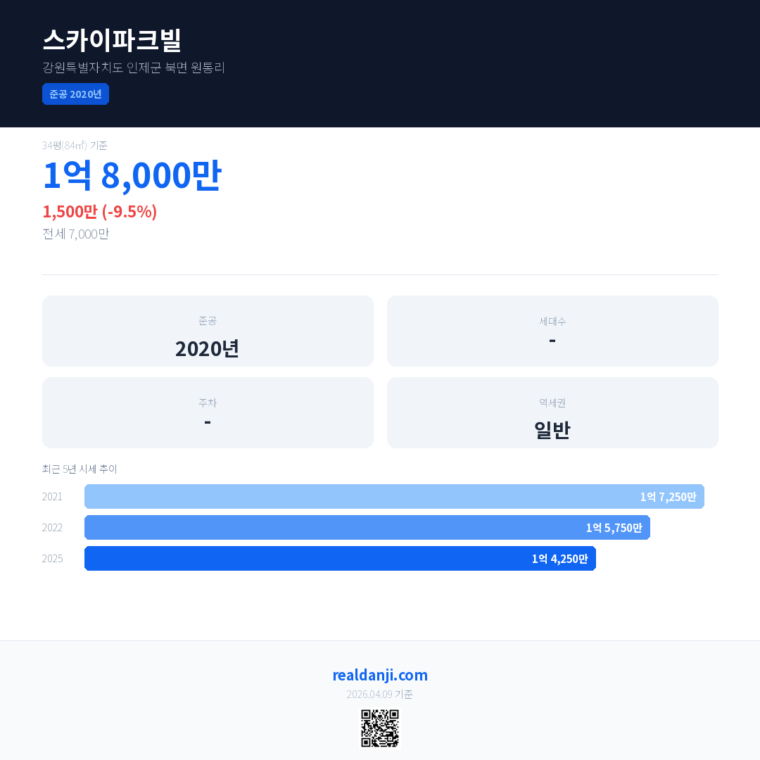 스카이파크빌 국민평형 기준 2025년 평균 거래가는 1억 4,250만으로, 전년 대비 9.5% 하락 했습니다.
