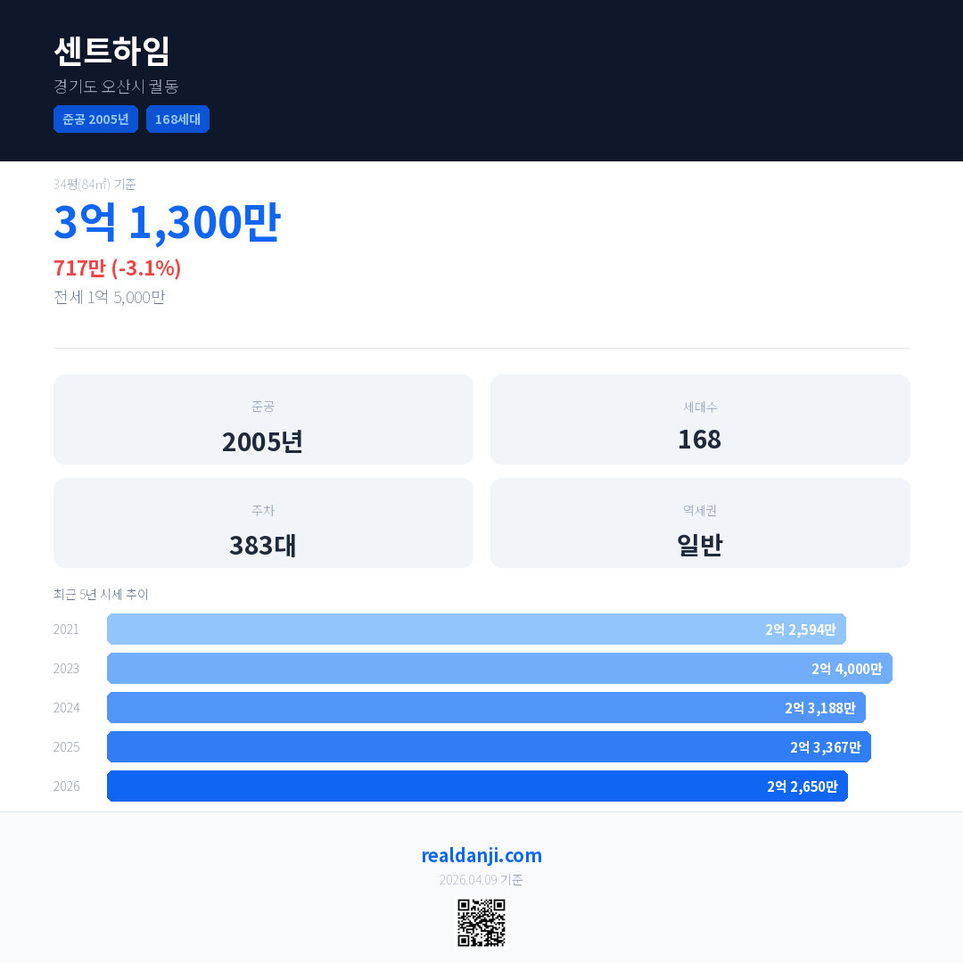 센트하임 최근 거래가는 3억 1,300만입니다. (2026-03)