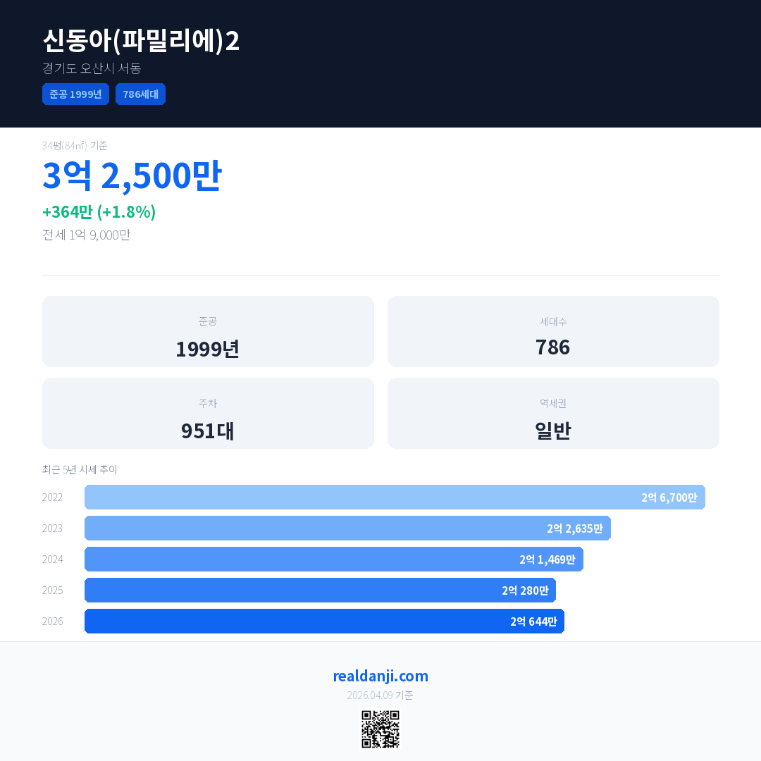 신동아(파밀리에)2 국민평형 기준 2026년 평균 거래가는 2억 644만으로, 전년 대비 1.8% 상승 했습니다.