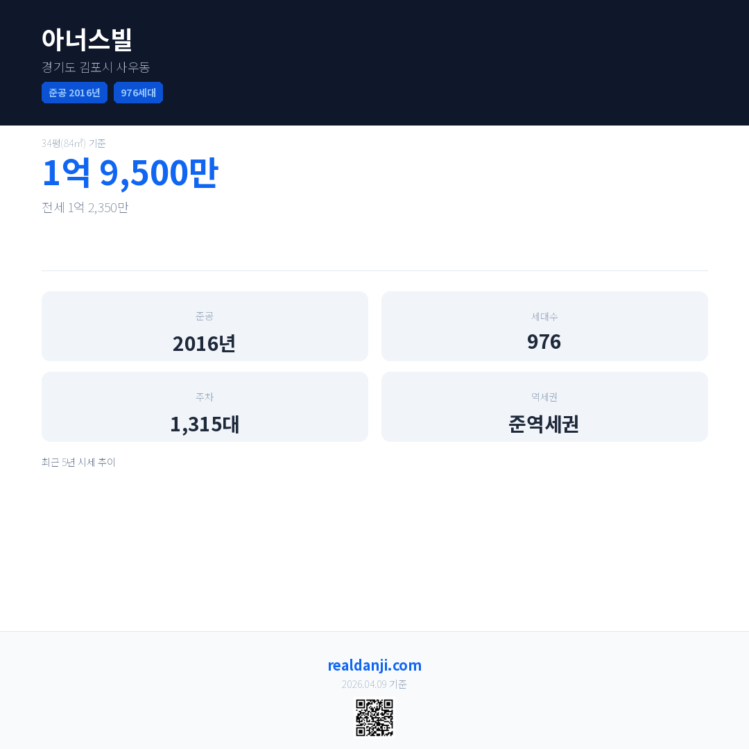 아너스빌은(는) 2016년에 준공되었으며, 현재 10년차입니다. 총 976세대 규모입니다.