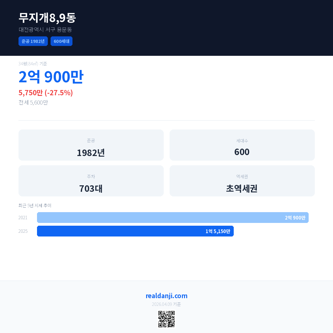 무지개8,9동 국민평형 기준 2025년 평균 거래가는 1억 5,150만으로, 전년 대비 27.5% 하락 했습니다.