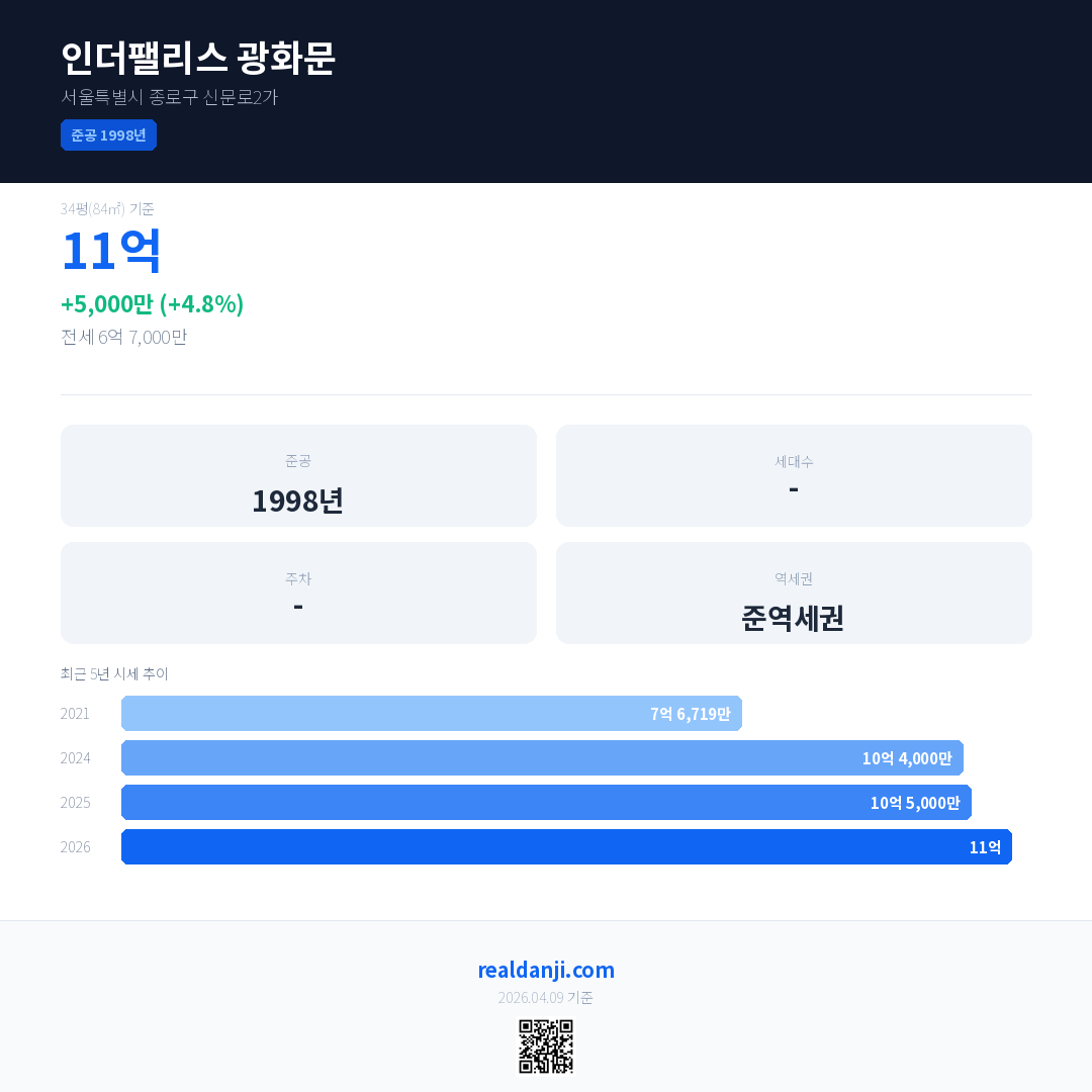 인더팰리스 광화문 국민평형 기준 2026년 평균 거래가는 11억으로, 전년 대비 4.8% 상승 했습니다.